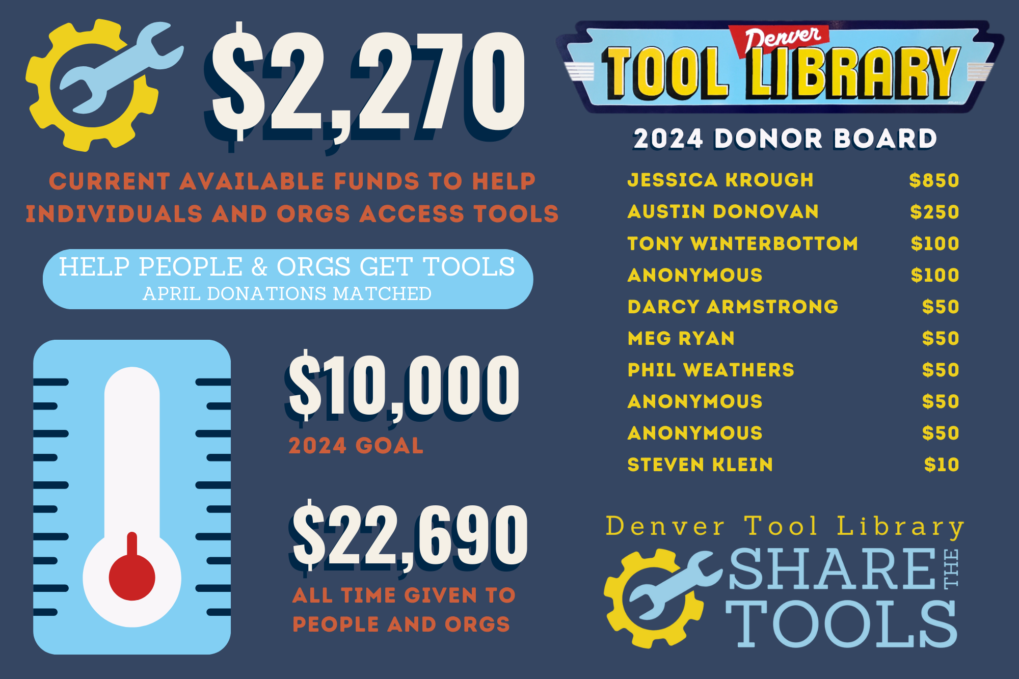 The Denver Tool Library turned 9 years old this month, and for our birthday we are asking you to help us start our new Share the Tools fund! Best part is, during our fundraiser from April 1st to April 30th, 2024, all donations are matched dollar for dollar!