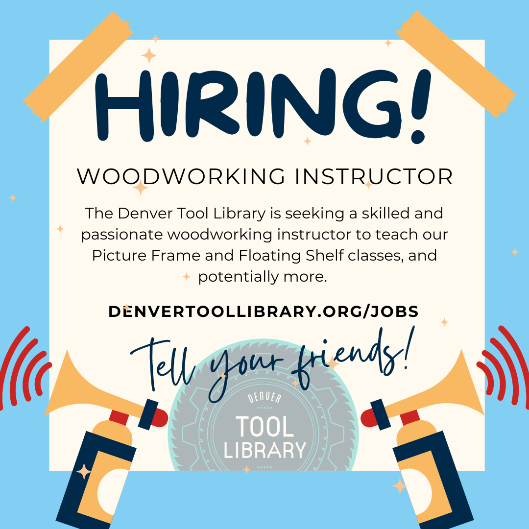 Job Summary: The Denver Tool Library is seeking a skilled and passionate woodworking instructor to teach our Picture Frame and Floating Shelf classes, and potentially more. This position offers good pay, flexible scheduling, and opportunities for growth. If you're enthusiastic about sharing your expertise with a community of makers, we'd love to hear from you!