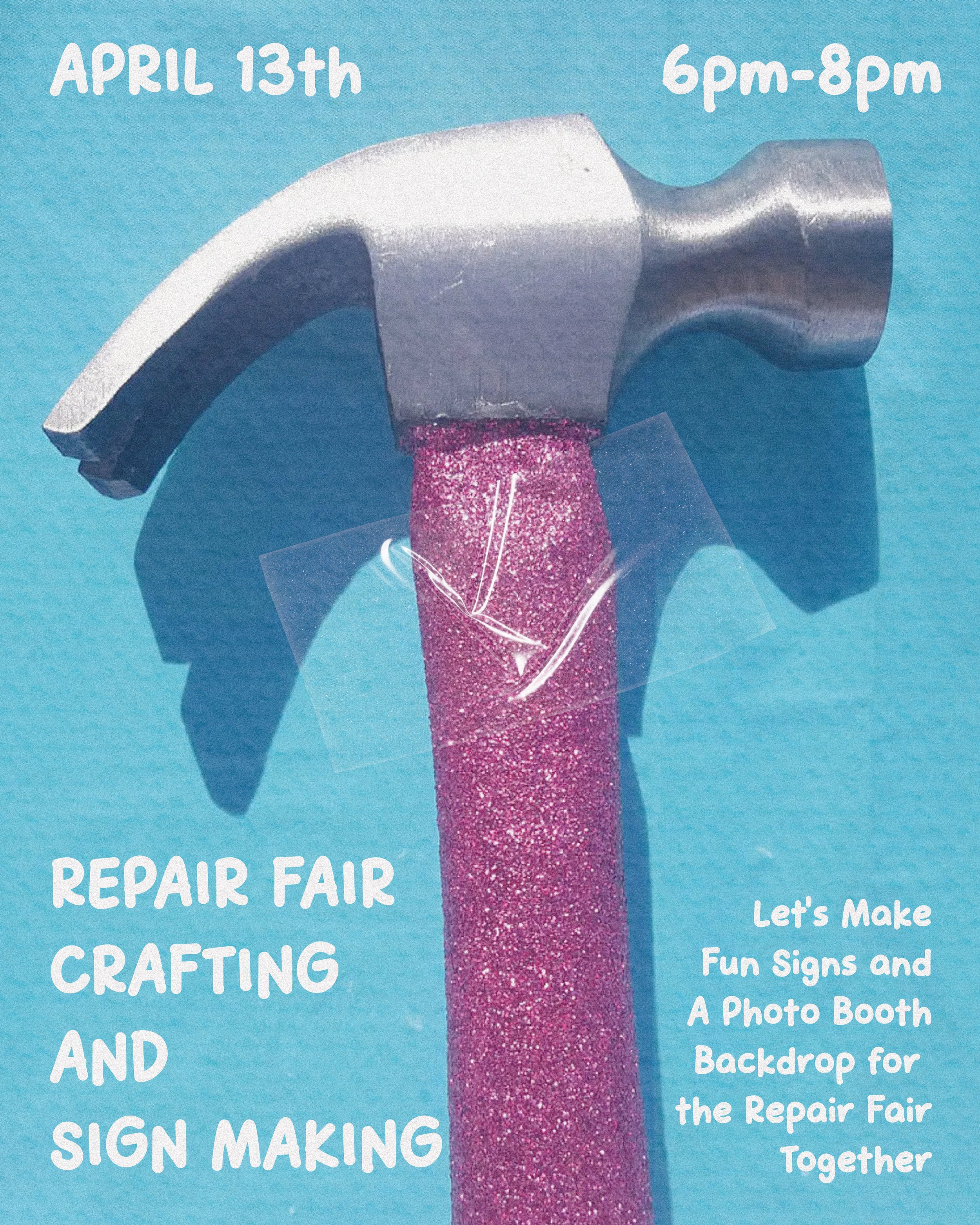 On April 13th from 6pm to 8pm we’ll be having a craft party! Join us to make signage and a photo back drop for the upcoming Repair Fair. Register for free here.