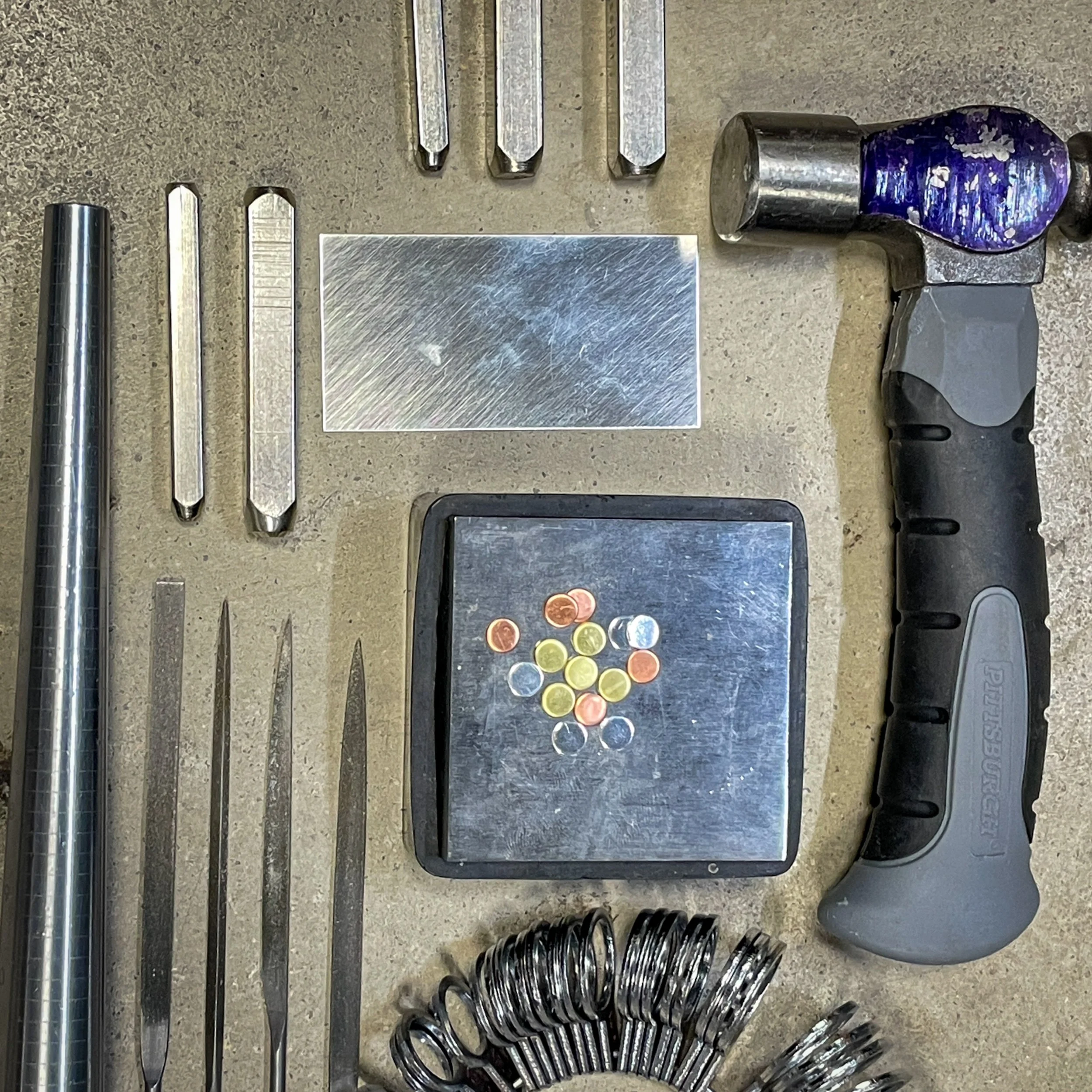 Jeweler’s files, ring mandrel, soldering torch, texturing hammers, metal stamps, and polishing equipment.